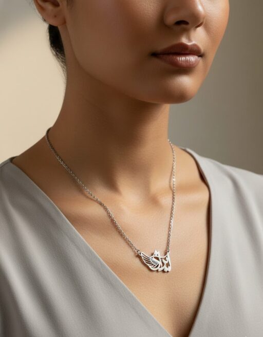 A unique anti-allergy stainless steel necklace โIranโ in artistic Persian calligraphy with an elegant wing-shaped design.