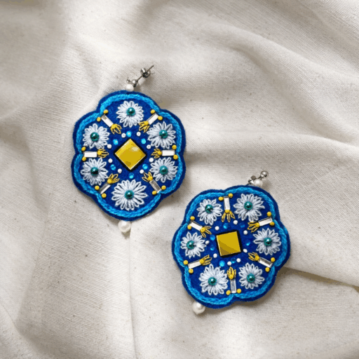 Handcrafted Kahroba Earrings featuring colored mirrorwork on a soft base. Approx. 6 cm in height, with hypoallergenic stainless steel posts, part of the 2024 Sabzpari Collection.