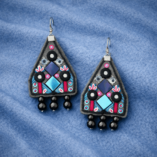 Handcrafted Mavi Reflections Earrings combining colored and classic mirrorwork on a soft felt base. Entirely handmade without pre-drawn patterns, approx. 4 cm in height, part of the 2022 Sabzpari Collection.