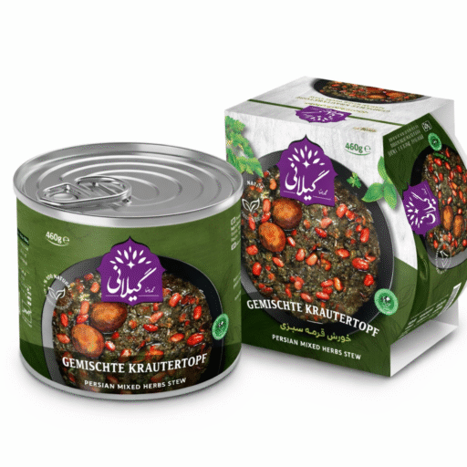 کنسرو قرمه سبزی بدون گوشت گیلانی, Ghormeh Sabzi , fully cooked and ready-to-eat. Authentic flavor, slow-cooked herbs, and rich taste in a convenient can.