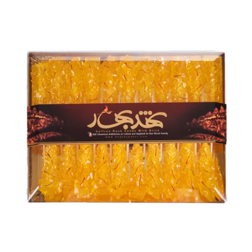 Persian Saffron Rock Candy Stick (Nabat) – 500g pack made with real saffron. Naturally sweet, aromatic, and perfect for tea or gifting.