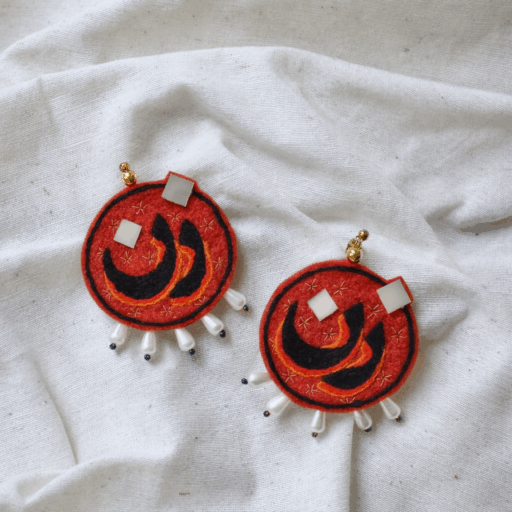 Handcrafted Zan Earrings, with mirror and needle embroidery on a soft felt base. approx. 4.5 cm wide, part of the 2023 Sabzpari Collection.